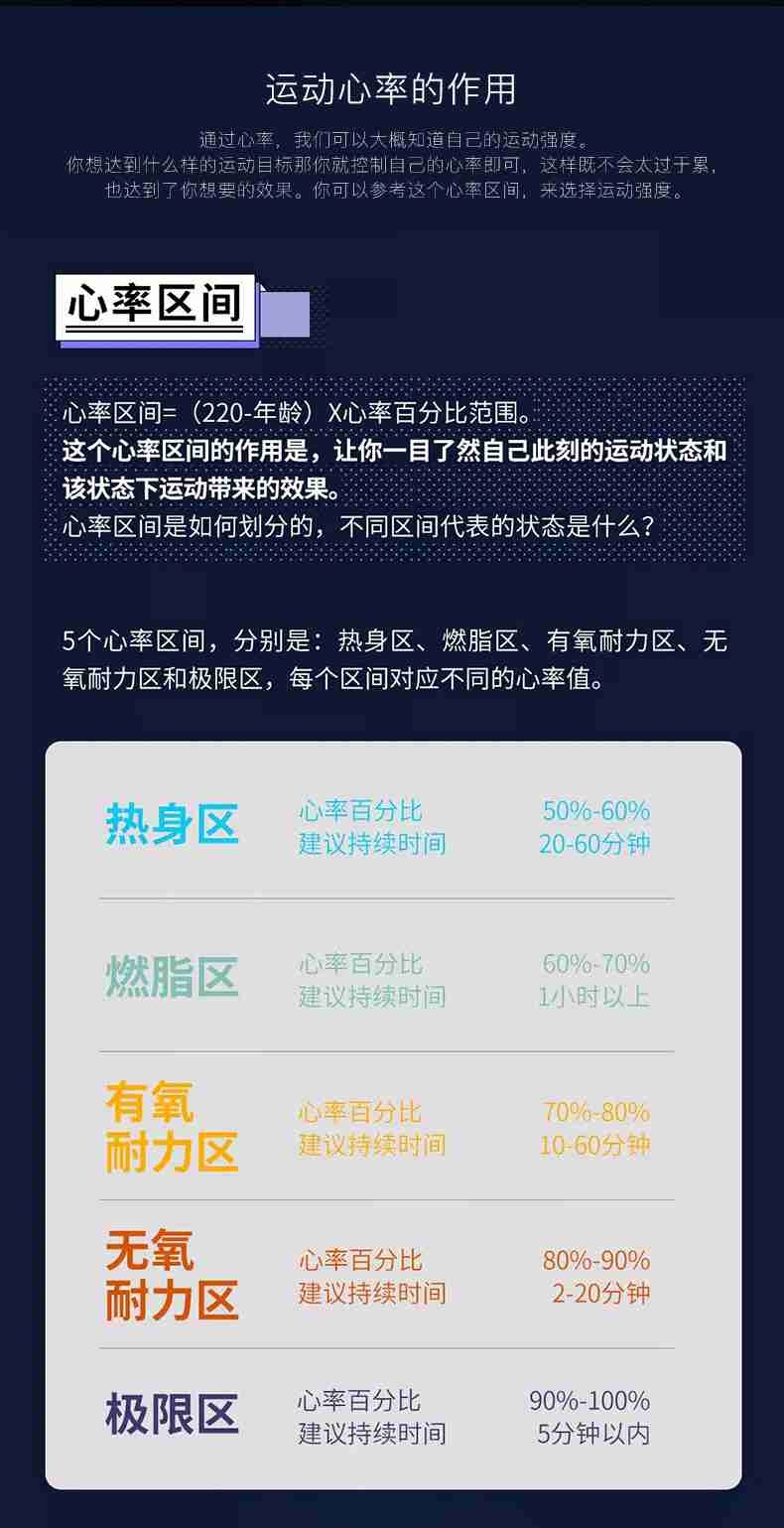 通过监控心率来控制运动量是非常重要的,正如人体其他器官一样,心血管系统也只有在一定的运动强度刺激下才能得到改善,但这个强度又不能太高,否侧就变成了无氧代谢运动。