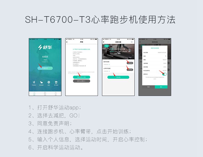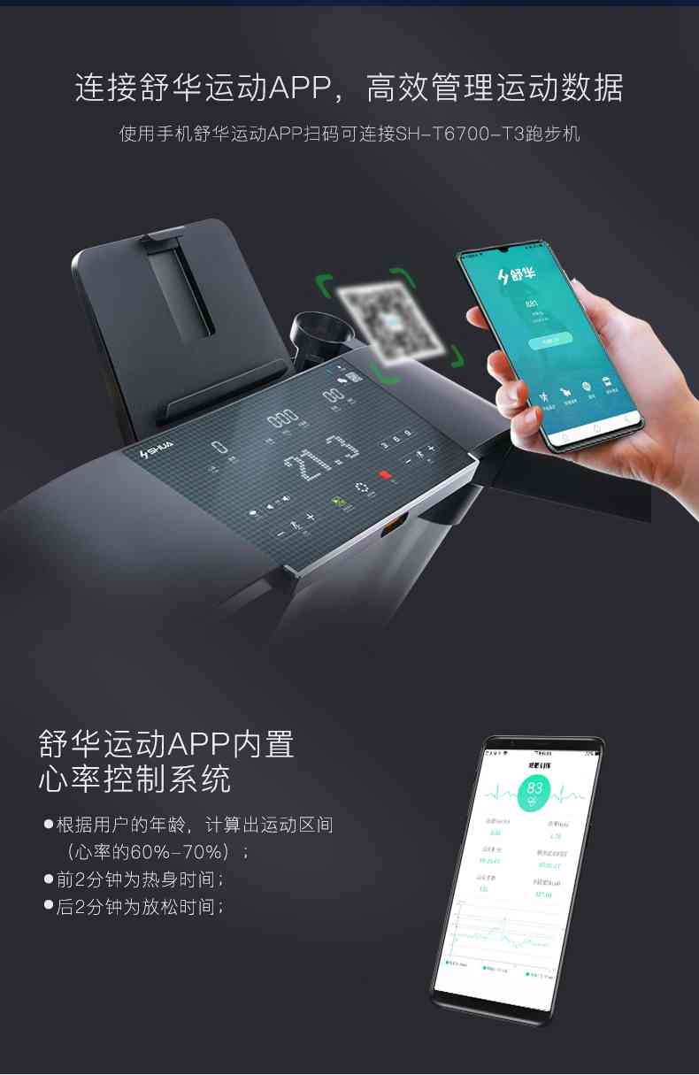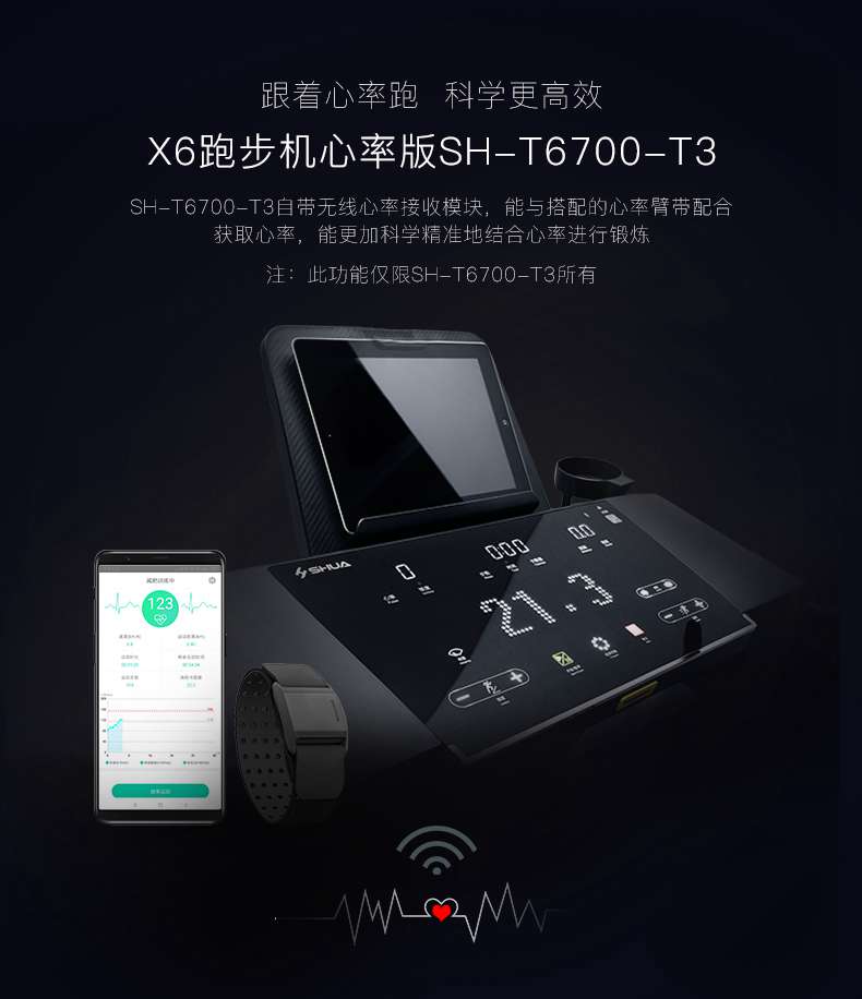 SH-T6700-T3跑步机为了帮助用户进行更加科学有效的运动,搭载MK体育恩波利APP连接心率臂带实现心率控制,通过监测运动心率从而实现科学运动。