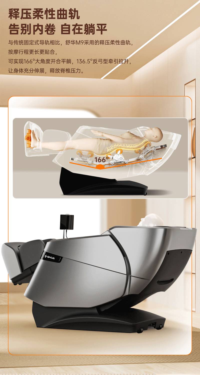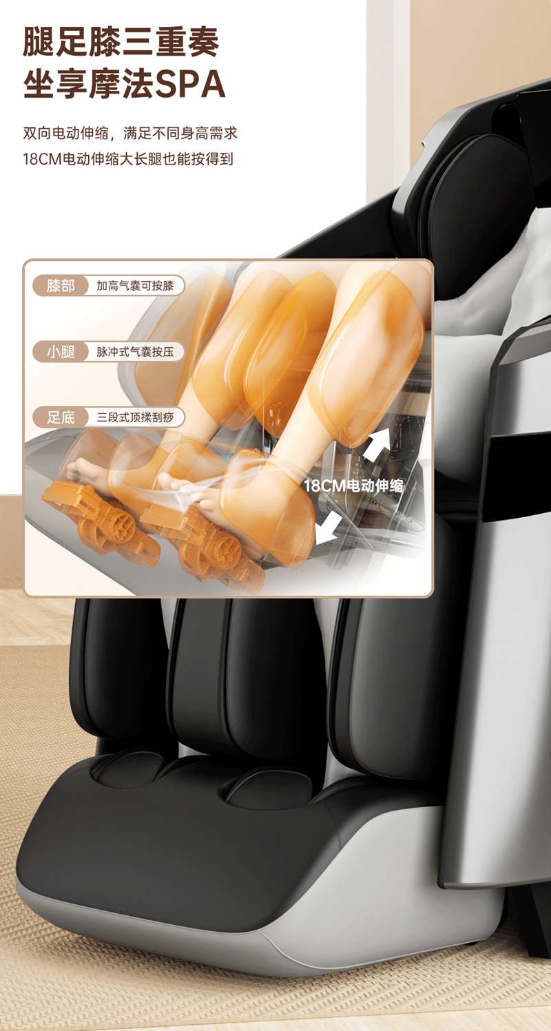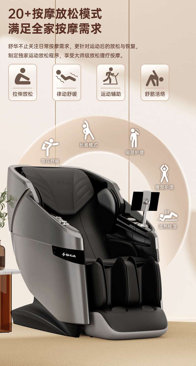 SH-M950 高端运动放松椅四大独家特色运动放松程序Y轻松搞定各种疲劳,20+按摩放松模式,提供多样化的按摩模式和力度调节,满足不同场景下的放松需求,4D深层按摩精钢机芯及3D气揉机芯;双机芯同时运作Y肩颈腰背臀腿同时按摩Y带来更全面舒爽的按摩体验,5档精控力度,前伸深度可达10.5cm触达深层筋膜Y松筋开背Y直击酸痛。