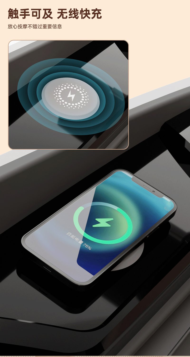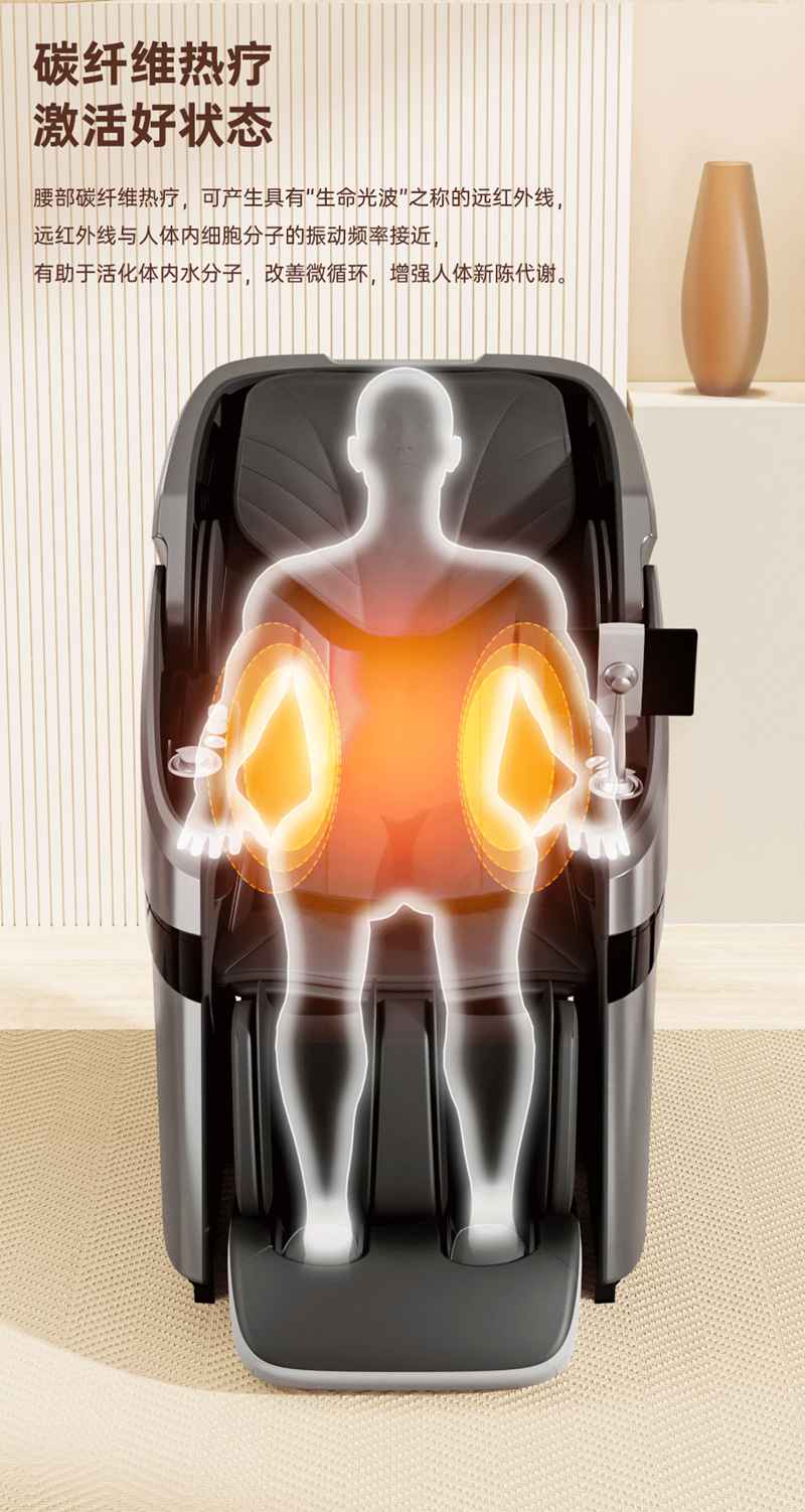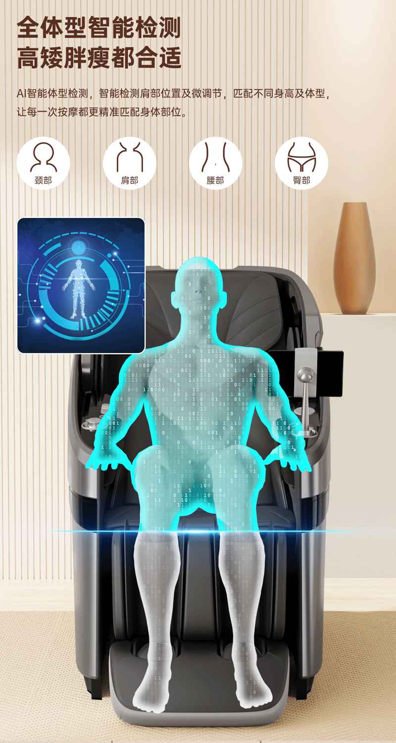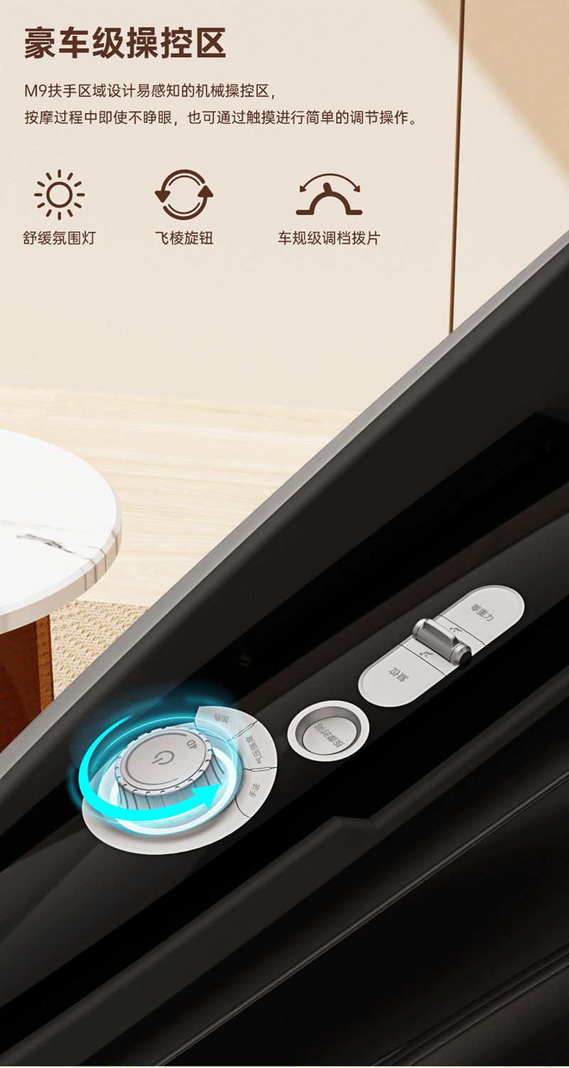 SH-M950 高端运动放松椅四大独家特色运动放松程序Y轻松搞定各种疲劳,20+按摩放松模式,提供多样化的按摩模式和力度调节,满足不同场景下的放松需求,4D深层按摩精钢机芯及3D气揉机芯;双机芯同时运作Y肩颈腰背臀腿同时按摩Y带来更全面舒爽的按摩体验,5档精控力度,前伸深度可达10.5cm触达深层筋膜Y松筋开背Y直击酸痛。