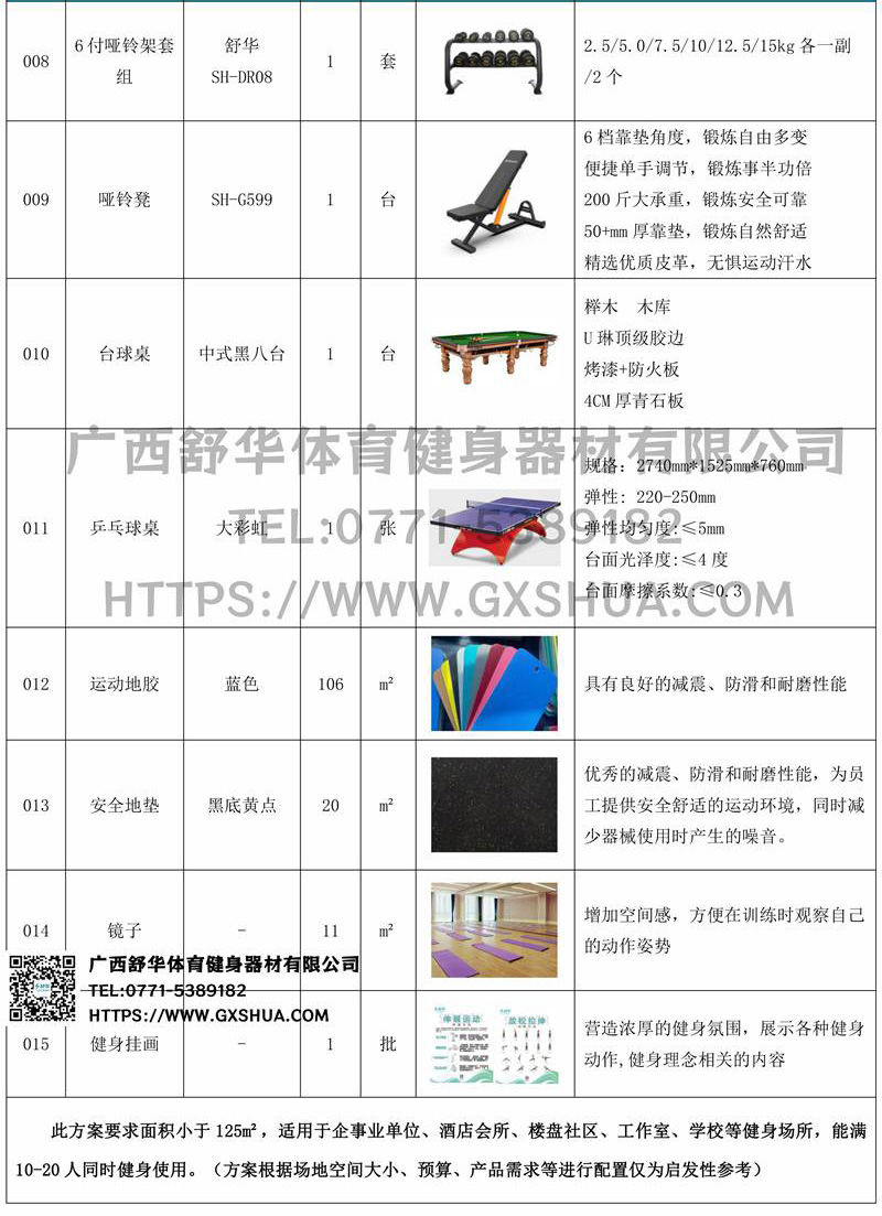 此方案要求面积小于125m²,适用于企事业单位、酒店会所、楼盘社区、工作室、学校等健身场所,能满10-20人同时健身使用。(方案根据场地空间大小、预算、产品需求等进行配置仅为启发性参考)